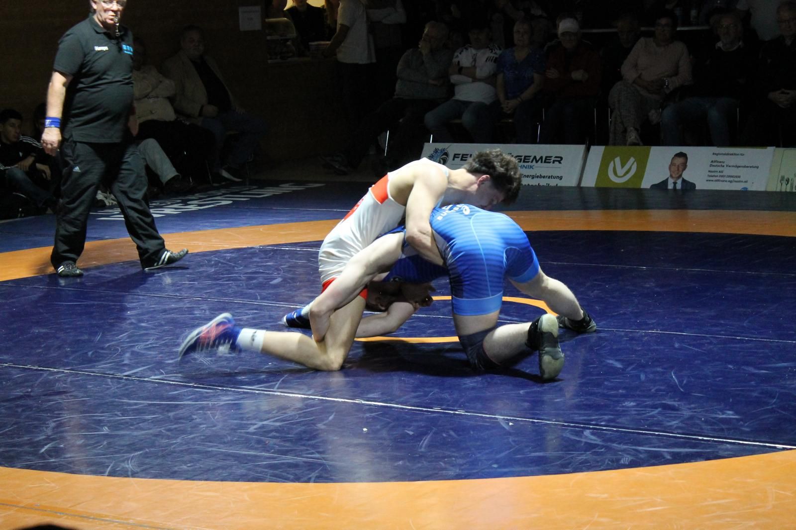 Noch schneller ging es im darauffolgenden Aufeinandertreffen zwischen Vadym Tatarchenko und Emre Sag. Der Nürnberger ging sehr passiv in den Kampf, konnte den ersten Doppelbeinangriff jedoch nicht verteidigen. Vadym packte Sag auf seine Schulter und beförderte ihn in hohem Bogen direkt auf die Bretter, Schultersieg nach gerade einmal 40 Sekunden.